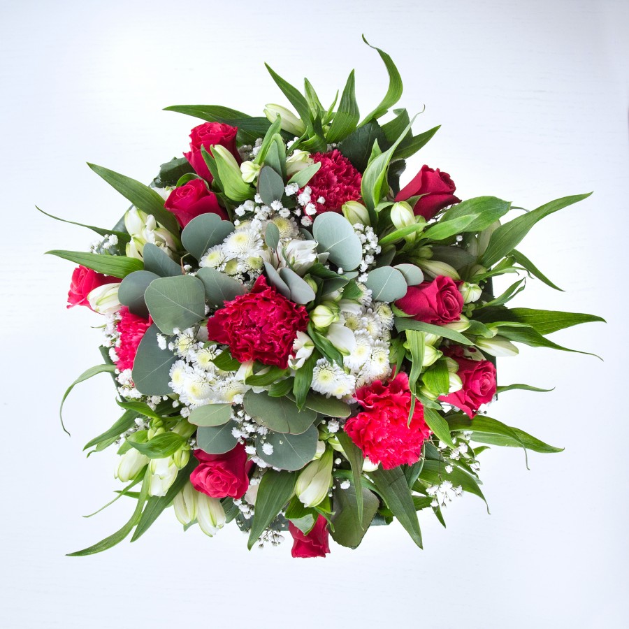 Immerse yourself in the beauty and uniqueness of our stunning bouquet. This arrangement features vibrant red roses and elegant white chrysanthemums, harmoniously blended with delicate gypsophila and charming carnations. The addition of white alstroemeria and lush aspidistra leaves creates a captivating design that stands out in any setting.