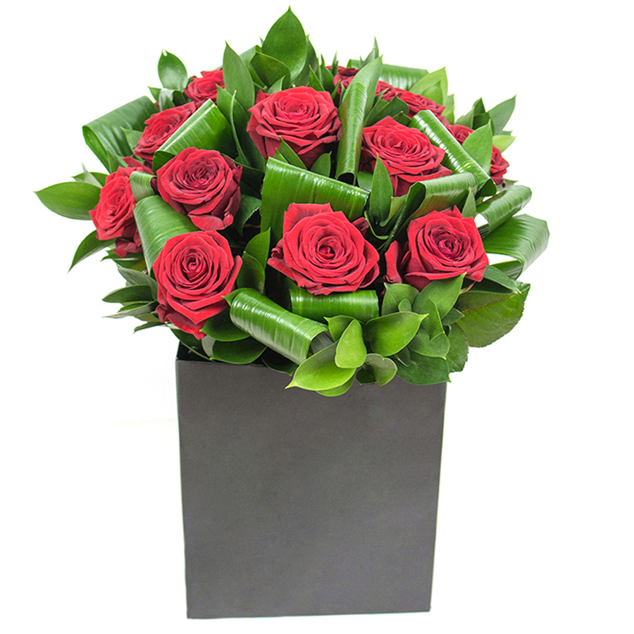 Celebrate beauty and elegance with our luxurious bouquet, featuring rich red roses, vibrant aspidistra leaves, and elegant ruscus. This unique arrangement is designed to enhance any home with its stunning colors and sophisticated design.